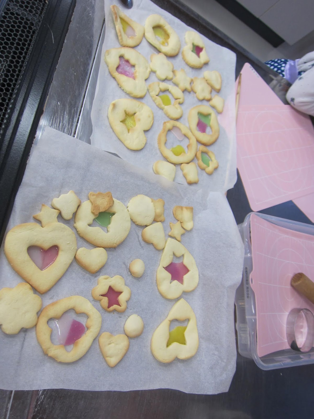 クッキーの型を取った後、真ん中にキャンディーを入れて焼くとキャンディーがとけてステンドグラスのようになります。どんなクッキーに焼けるかドキドキでしたが、きれいなクッキーが焼けて良かったですね。